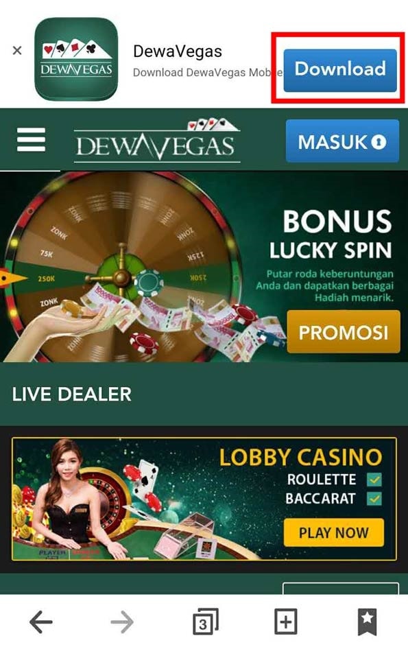 1. Masuk ke menu Browser Mobile anda dan Kunjungi www.dewavegas.com setelah itu klik menu MOBILE lalu klik button Download Now , dan tunggu proses download selesai.